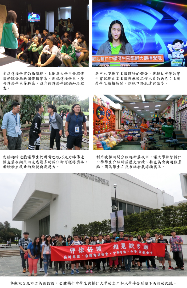 《輔仁大學相見歡活動志工回饋》 公衛系 林子意: 雖然我已經不是輔中的大學伴了,但是為了見許久不見的孩子,還是決定參加!由於這次的相見歡是在段考週,所以行前會議、籌備和複習考試內容要同時進行,讓我有點壓力><,但還好結果他們來的時候一切順利,這樣值得了!其中最令我印象深刻的是去攝影棚和美術館,因為那時候才跟小學伴有比較多話說,也很高興他們樂在其中,比較可惜的部份是我沒有參與到新莊廟街和逛花博的部分,不然就可以多跟他們聊天了~~ 希望他們能夠珍惜這趟旅程,能夠感受到輔大對他們的愛和給予,也期許他們在未來有找到自己的興趣,著目標邁進。 社會系 陳家亮: 陪伴,不僅止於面對面讓彼此內心擁有安定感;透過網路的力量,我們可以在各式各樣的視訊軟體見到彼此,讓對方知道,在距離自己方圓幾百公里的遠處,正有一炬暖火,保護著他,引領他成長。 然而,現代人愈來愈依賴科技,明明相隔咫尺之間,卻寧可透過3c產品交流,我們應該重新思考某些科技對我們的必要性。 這次的相見歡活動,再次的印證了近距離的陪伴遠比兩人坐在冷冰冰的機器上百次還要來的快樂。也讓我體會到,其實他們不一定需要我們,但我們卻需要他們。 辦活動往往不是為了別人,就像大二辦給大一的迎新宿營一樣,我們其實也渴求著別人能夠參與我們設計的活動不是嗎?如同盡心準備佳餚的母親,看到孩子滿足的面容一般。 中文系 宋麟侑: 認識了一群很棒的夥伴一起籌備這次的活動,從活動中重拾了以往的經驗,不過人數多了點就是了,也為之後自己的活動教案做準備,雖然現在也有主持過不少活動的經驗,但這麼真實的跟一群來自遠方的孩童作介紹覺得這是另一種生命的成長與體悟。 一切的一開始都很辛苦很忙碌,在短短的籌備期內還卡了個期中考,所有事情都在同步進行,一個接著活動結束後,又有另一個活動的來臨,一個會議卡了一個會議,絲毫沒有喘息的空間。從看到孩子的剎那以及帶教案時他們的專注與投入,就覺得一切的辛苦好像都不算什麼了,這是件很有意義也很有價值的東西。 按部就班的事情,人人都可以實行;但隨機應變的能力並非人人皆有,兩天的活動中有著不少的插曲,同時也驗證了這幾年下來磨練事態的能力。 透過相見歡的活動,也讓我跟小學伴的距離更近了……。從害羞怕生的小孩到雖不至於能侃侃而談,但卻能夠,也願意帶我更進入他們的生活細節中,覺得這將近一年在遠距的時間,好值得、好滿足,也好有收穫。是真的在做一件有意義,而且能影響生命的事情。