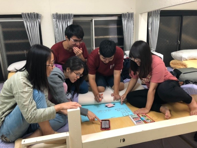 第一天傍晚進行小組共融活動,採取小組討論的方式於士林夜市進行食字路口,每一組人員必須遵從上一道食物的最後一字來尋找下一個食物,例如:香蕉煎餅-餅乾-甘蔗雞-雞排-排骨酥…。過程中有突發指定任務出現,團隊必須同心協力完成任務隊伍方能繼續尋找美食。並透過夜間分享與討論的時間,述說內心對團隊的期許與建議,也針對未來團隊幹部的任務執行進行工作分配。
