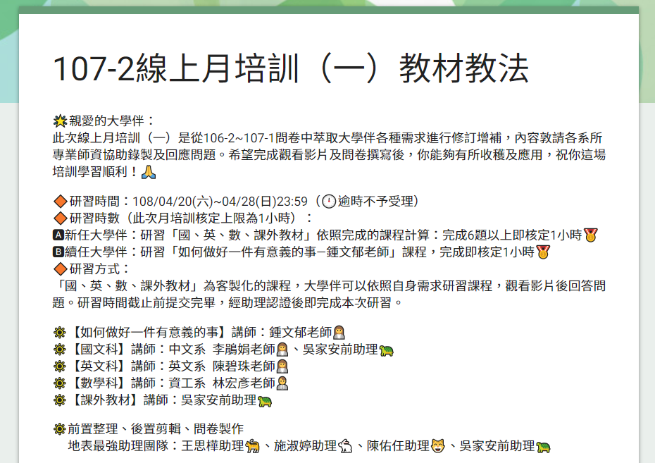 以線上Google表單方式來說明本次月培訓的課程內容及培訓方式,大學伴可以依照自己的時間、科目、想學習的主題,自由選擇課程進行研習,修滿6則課程經過助理核定,即可獲得1小時的研習時數,具體說明如文末圖示: