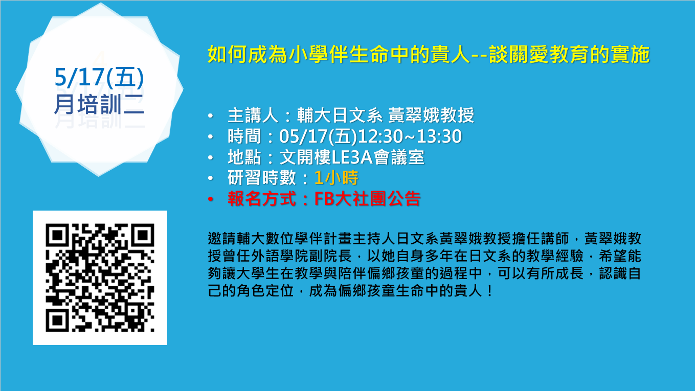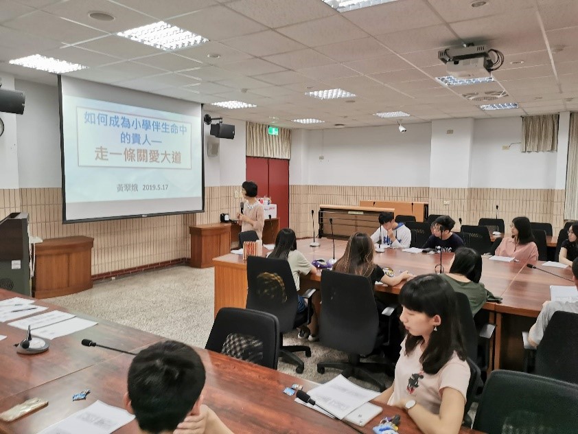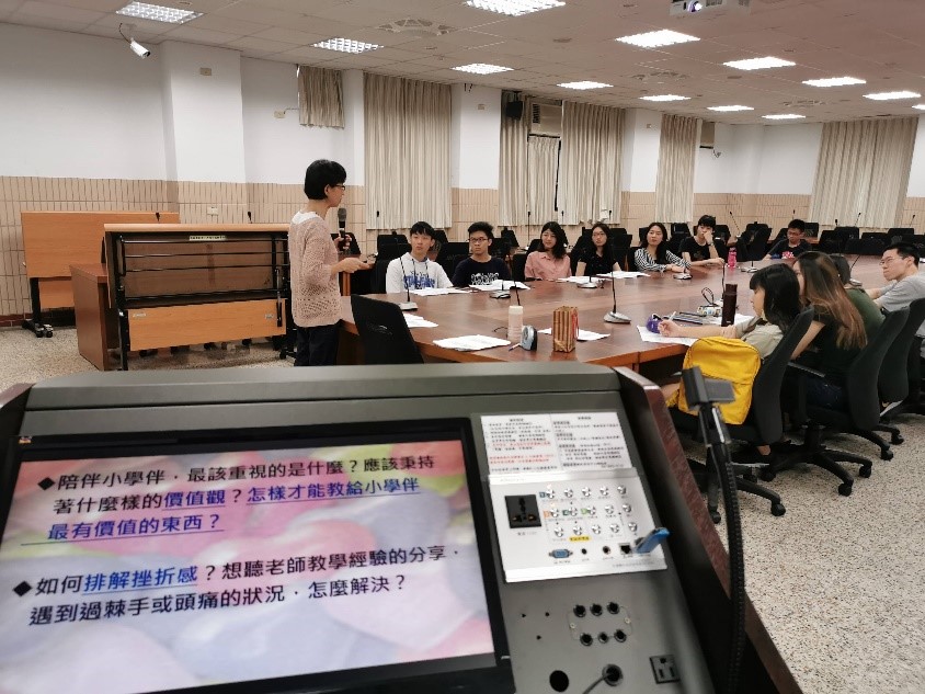 邀請數位學伴計畫主持人—日文系黃翠娥老師來擔任講師,以老師多年教學的經驗談,來鼓勵大學伴如何用關愛教育的方式,用愛心、耐心來陪伴偏鄉的小學伴們。