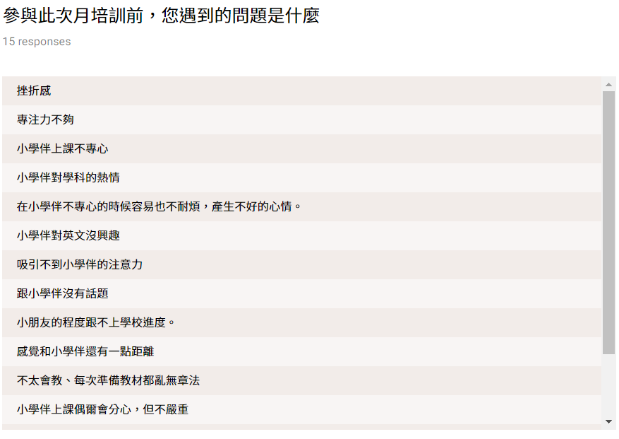 老師真的很讚,心態上有不少收穫和改變。謝謝!老師的很多想法我覺得很厲害也很偉大。以後也會想找你聊一聊,但其實我之所以提出:「對於小孩訴說心事的問題無法好好給予鼓勵。」是因為生活背景實在有太大的差異,所以當他說自己家裡的事或心情上的感受,我有時真的不知道怎麼回應他。我懂那種難過跟無力感,可是我說不出什麼,想給予他一個擁抱,但我們是在電腦中對話。他平常是一個很活潑的小孩,但是因為家裡狀況而跟我分享時,我很難過自己沒辦法幫他分擔或安慰他。