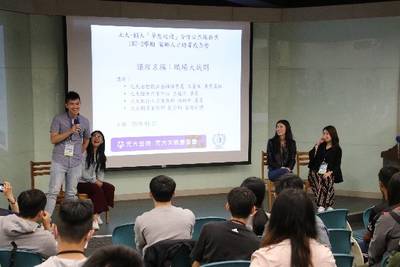 - 職場大哉問:邀請元大人為學員進行職場與就業環境的介紹與認識,使學員們能夠了解不同的行業,以利其未來在抉擇科系甚或是就業環境時,能有更多的選擇,提早認識可能會面臨到的情形。