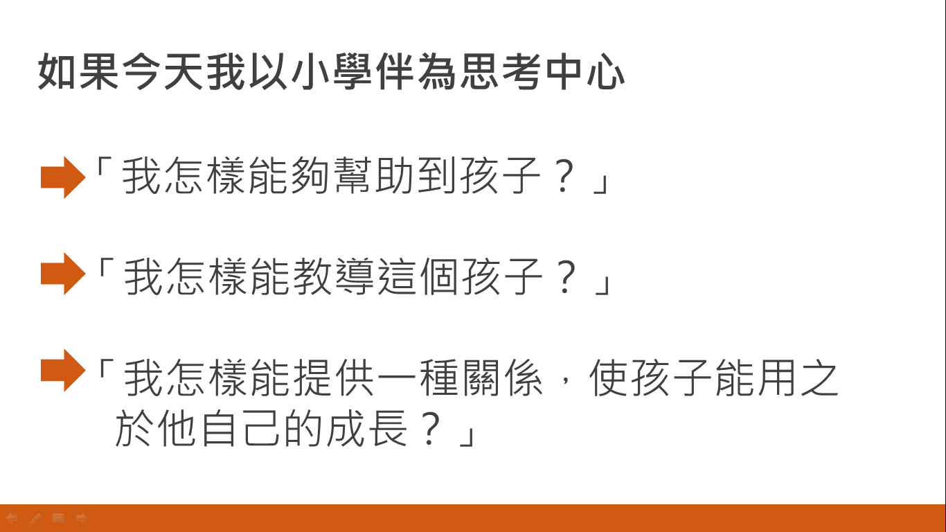 伴讀教學中需要考量的不僅是傳授學科知識,而是與人的互動與溝通,因此希望透過班級經營管理的方式,讓參與者能知道關係經營的重要,以及藉由管理技巧增加時間規劃、課程安排的能力,提醒大學伴需要以學習者為中心進行思考如何實現「生命陪伴生命,生活教導生活」的核心理念。