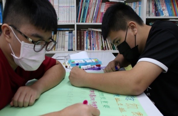 每個孩子都有自己的想法和個性,我喜歡觀察和了解孩子們的特別之處,給他們表達自我的空間,像柏○能利用課堂上剩餘的材料創作出屬於自己獨特的作品,有一次他拿珍珠板做了一把槍,我在覺得很有趣同時也不吝嗇地稱讚他做得很精緻;還有剴○喜歡畫畫,他總是在學習單或小組海報上畫出他喜歡的圖案,我覺得能發揮自己的專長和創意並讓別人看見是一件好事,但也希望孩子們在發揮創意的同時能適時地投入課程中。在營隊期間我觀察到大園的孩子們最難人可貴的一點是他們對於事物都抱有一定的好奇心且主動去探索,或許在手作課程中會遭遇ㄧ些困難或挫折,但他們從不輕言放棄。