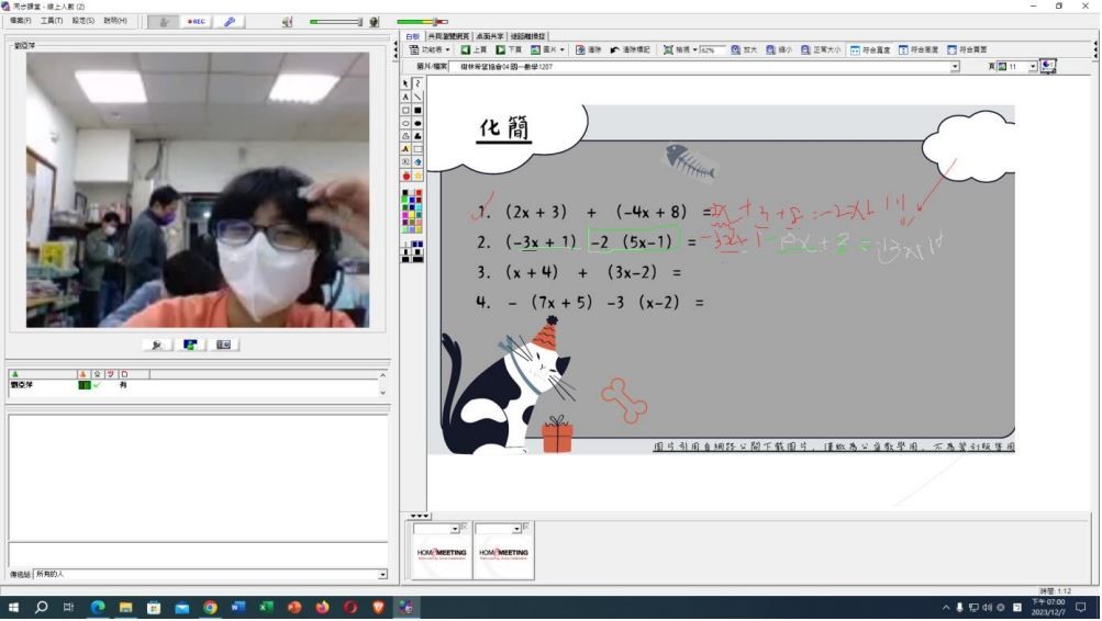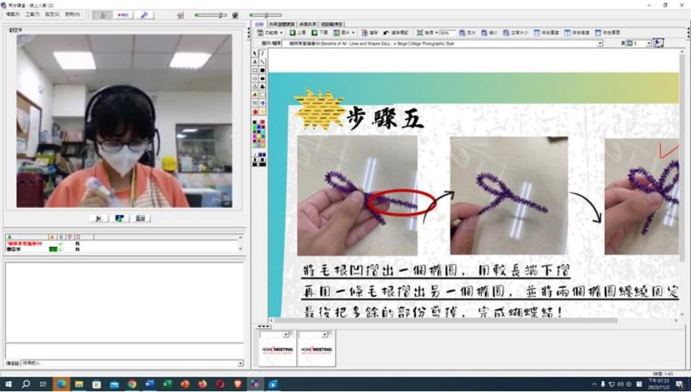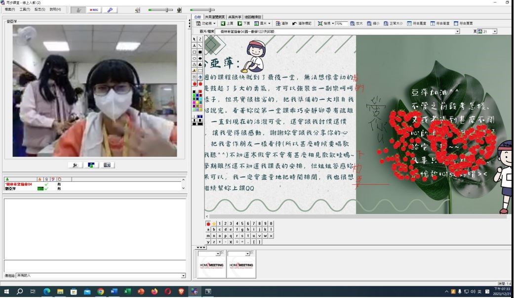 終於還是迎來見面的那天,我衝她尷尬的笑,因不熟悉設備而慌慌張張地把內心早已演練多次、但真正說出來又顯得單薄的自我介紹說完。換她自我介紹時,她需要我用詢問的方式引導,亦不會自己多加一些生動的形容詞,其餘時間都是默默地盯著我看,讓我有些招架不住 QQ 還好第一週是前測,沒有太多會空氣凝結的場景。雖然找不到一個確切的時間點,但每週這樣上課我感覺得出來萍萍漸漸的會主動跟我分享她的校園生活以及心情;會跟我開玩笑似的討價還價,也會問我很多我的事情。與其說她是我教的學生,感覺更像是好朋友。