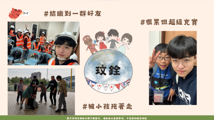 這次課程加入許多新鮮的講座,像跟時代尖端的AI工具運用、以青少年議題分組互動探討,以及大學伴的故事分享,都讓我覺得受益良多。我認為加入互動環節讓整個教育訓練不再只是純聽演講,反而有身歷其境,真正參與其中,雖然一開始很擔心會搞砸,因為我不太擅長人際互動,但實際上比想像中好,同時也見識了每個大學伴的不同樣貌,像有的人擅長統整資訊、有的人善於表達、有些人光說話就能令人大笑,十分幽默,其中發現自己比想像中還要能夠表達,感覺可將這次的經歷運用在與小學伴的互動上。