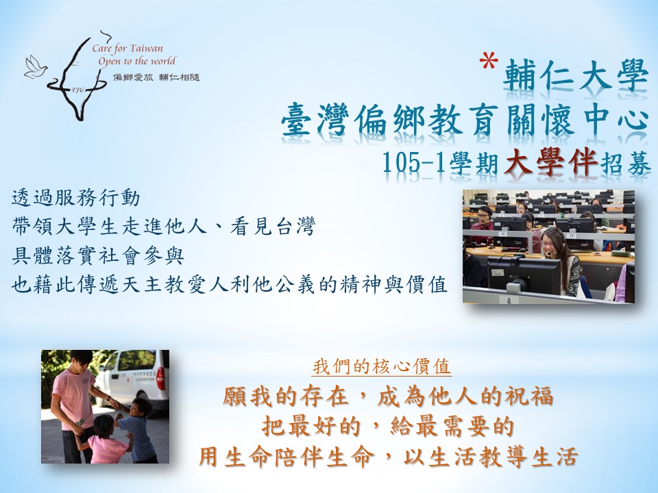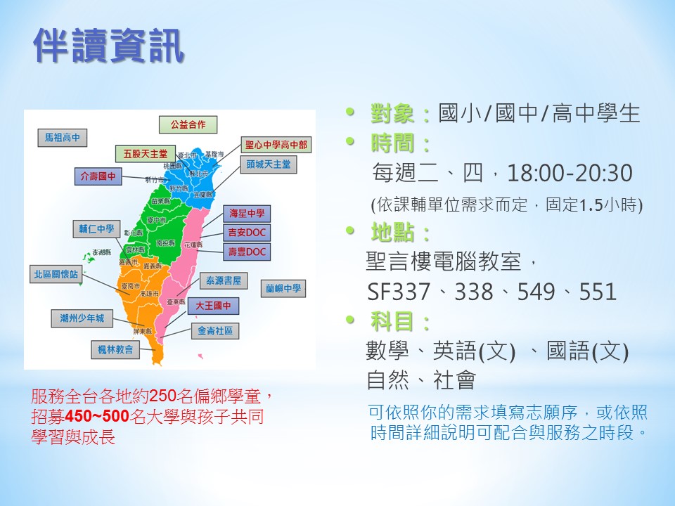 我們邀請你來成為孩子學習路上的一位夥伴,以下是關於輔大數位學伴招募的相關訊息,包含服務方式、對象及時間,還有更重要的是這學期的行事曆-開課及培訓時間,誠摯地邀請也真切的需要每一位的你來成為我們的夥伴。