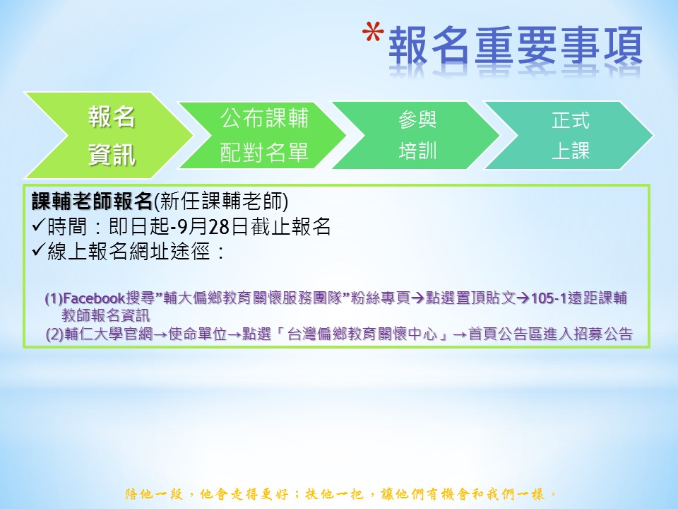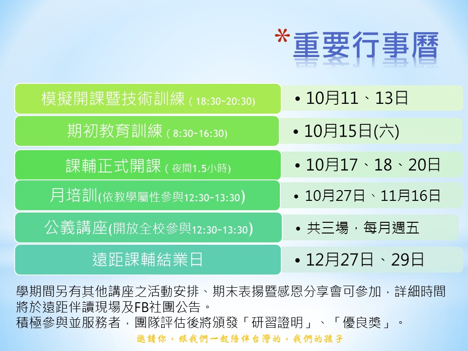 ※「續留」課輔教師報名(截至9/26),想延續104-1學期遠距伴讀,請點選: