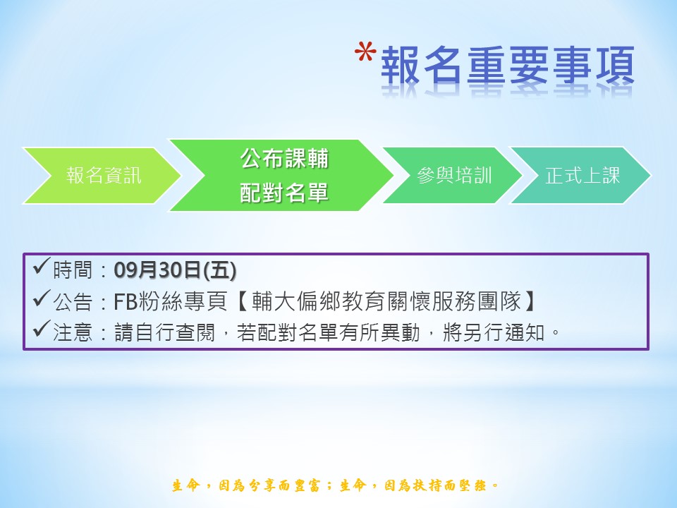 09/30(五)於FB粉絲專頁【輔大偏鄉遠距課輔團隊】,公布配對名單